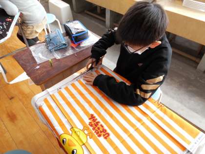ミシンで縫うことに慣れてきたので,ようやくエプロン作りに入りました。今回はエプロンの形になるように布を裁ちました。子どもたちは裁ちばさみを使ってたくさん布を裁つことは初めてだったので,緊張しながら黙々と活動していました。