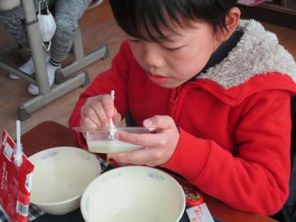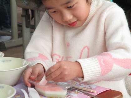 初めて食べる三色ゼリーに,子ども達は朝からウキウキ。