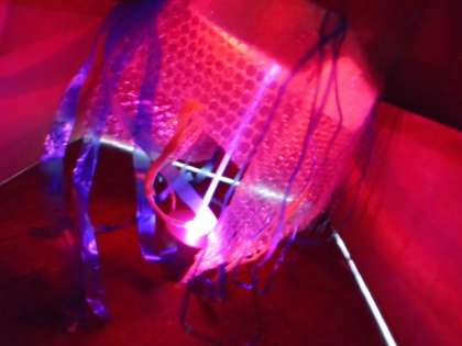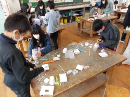 ストローやペットボトル,テープなどの材料を加工して,LEDライトの光を通す作品をつくっては試し,また考えてつくる,を繰り返して作品づくりを楽しむことができました。