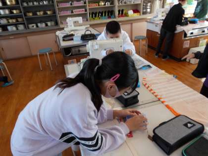 家庭科のエプロン作りもどんどん進んでいます。アイロンで折り目をつけて,まち針をうち,慎重にミシンで縫うを繰り返しています。わからないところは教え合いながら学習を進めています。完成が楽しみです。