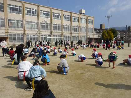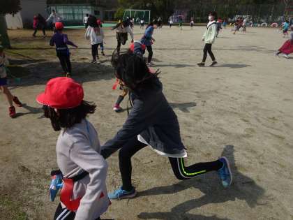 全校児童が広い運動場いっぱいに広がり,学年関係なく全力で