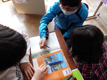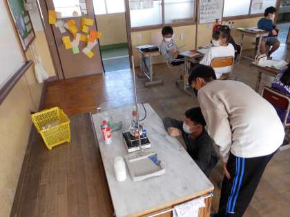 理科のおさらいとして,水蒸気について確かめました。丸底フラスコの中の水を沸騰させていくと,ゴム管の先から始めは空気が出始め,やがて湯気が出てきます。ゴム管の先を水につけると,泡が途中で消えました。また,火を消して水蒸気が冷やされていくと,ゴム管をつけている水が,丸底フラスコの中に吸い込まれていきました。どうしてそうなったかをグループで考えてみました。