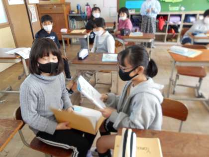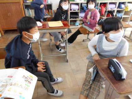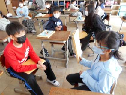 自分のお気に入りの場所について,地図を使って友達を道案内し,その理由も伝え合いました。実際の校舎地図を使って友達を道案内していると,だんだん道が分からなくなってしまったペアもありました。そんな時に“O.K?”などと相手の様子を見ながら,ゆっくりと伝えたり,理解できているか確かめながら繰り返し言ったりして道案内する姿もありました。