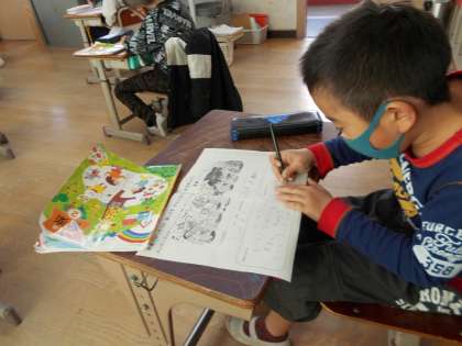 ききとったことやかんじたことを発表しあいました。そのあと友だちの発表を聞いて,「音の強弱があったよ」とか,「くりかえしがあったよ」「コントラバスの音がきこえた」などとワークシートに書いてまとめました。