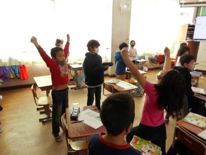 最後に曲に合わせて呼びかけるグループとそれにこたえるグループに分かれ,感じたことを体で表現してみました。