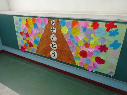 作った掲示物やお祝いの飾りがたくさん掲示されています。