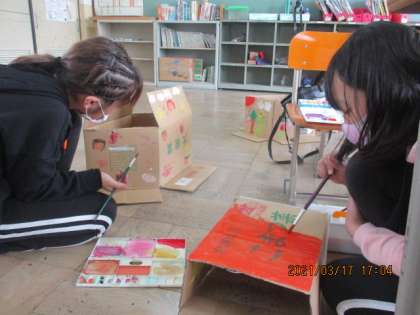 図工「ペタパタひらくと」で作っていた作品が完成しました。黙々と集中して色を塗り,制作していた3年生。ダンボールの形を生かした個性豊かなカラフルな作品が仕上がりました。