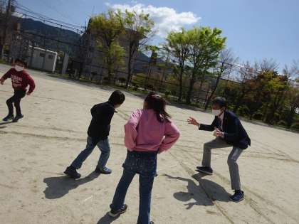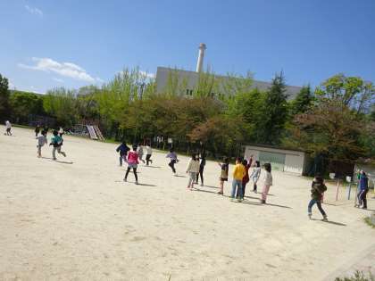 天気が良くて,運動場で元気に遊ぶ子どもたち。