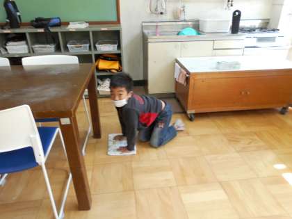 最初のそうじの時間は大そうじでした。教室の床をいっしょうけんめいふいてくれたのでぴかぴかになりました。