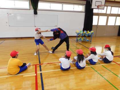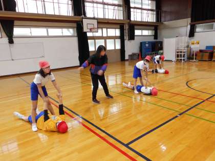 体育科では,体ほぐしの運動を行いました。2人組になって,相手の脚や腕を揺らしたり,体を反らせて伸ばしたりしました。次に,ボールをパスしました。直接届けたり,バウンドさせて届けたりしながら,投げたり受けたりすることに取り組みました。輪になって,順にボールを回すときに「・・ちゃんいくよ。」,「受けそこなったから,ちょっと待って。」とか声を掛け合ってうまくパスしていました。