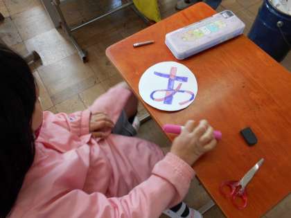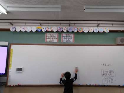 3年生が1年間に頑張ることを話し合って,学級目標にしました。『思いやりがあり助け合う仲がよいクラス』です。1文字ずつをそれぞれが思い思いに書いて仕上げました。支え合いと協力で仲良く楽しい1年を送ってほしいと思います。