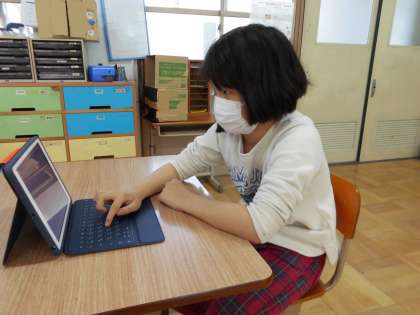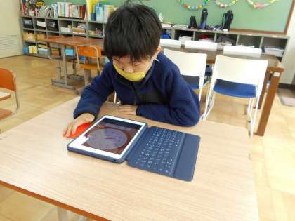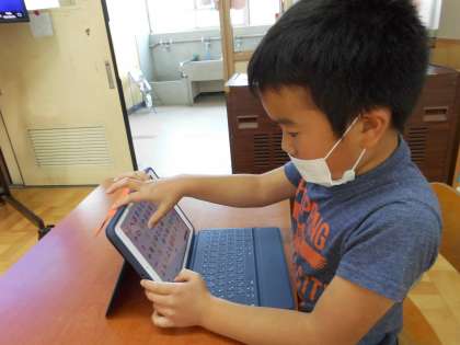 くすのきのGIGA端末はiPadです。今日初めて使ってみました。「わあ,アイコンがたくさん」「これはどんなアプリかな」自分に割り当てられたタブレットを使って,時刻の勉強や漢字の書き順の練習をしました。みんな興味津々です。「次はいつ使うのかな」次の時間が待ち遠しい子どもたちでした。