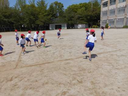 ボールの数を増やしたり,外野の横から投げるのありにしたりとルールを調整することで,動きの量が格段に増えました。