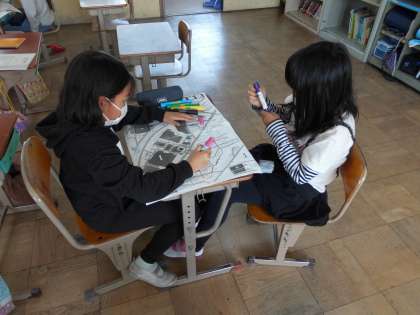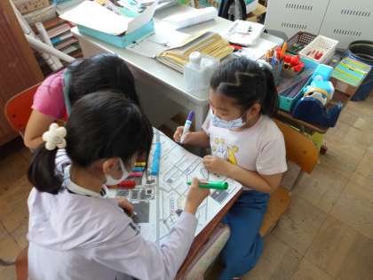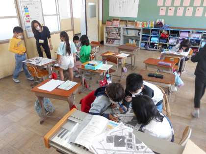 今日は地域の地図をグループに渡して,そこに公園やお店など地域にある建物や場所などを書き込んだり,印をつけたりしていきました。