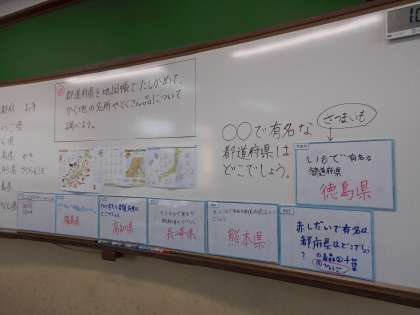 社会「わたしたちの県」では,地図帳を活用し,京都府の名所や他の都道府県の特産物などについて調べました。また,調べたことをクイズに出し合ってみんなで考えました。