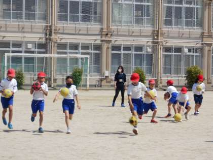 ボールを使って『からだほぐしのうんどう』をしました。ボールをつきながらサッカーゴールまでようい,どん!そのあと全員でドッジボールをしました。汗びっしょりになるくらいたくさん体を動かしていました。