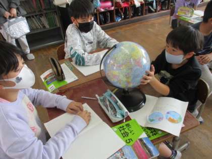 社会の「世界の中の国土」の学習で地球儀にはどんな情報がのっているかを探しました。実際にグループで地球儀を見て,見つけたことを出し合いました。いろいろな国があるだけでなく,縦横に線が書かれていることにも気付いていました。