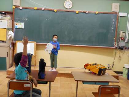 1年生が司会用のカードを見ながら,帰りの会の司会をしてくれました。日頃上級生のやっている姿をしっかり見ているからですね。