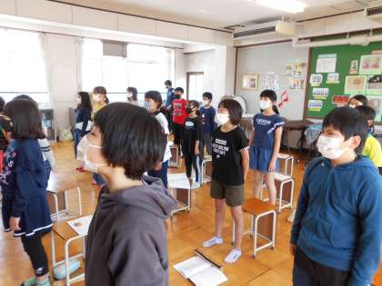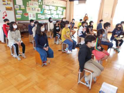 先生の自己紹介を聞いた後,自分たちの歌声を聞いていただき,お褒めの言葉をもらいました。中学校の音楽の先生と一緒に学習するのが楽しみですね。