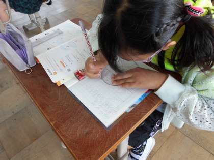 分度器を使って決まった大きさの角を書く練習をしました。200度の角のように180度を超える角については,補助線を入れたり,360度から補角を差し引いて考えたりしながら,かくことができました。
