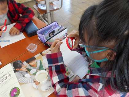 新しく「たねまき」の学習に進みました。3年生の理科の学習として,ホウセンカ,オクラ,ヒマワリ,ダイズを育てて,その成長を観察していきます。それぞれの種の特徴を観察し,自分が育ててみたいと思う種をカードに記録しました。虫めがねを使い方は,学習したように目の近くに持ち,種を動かして観察していました。また,種の大きさを定規ではかって記録することもできていました。