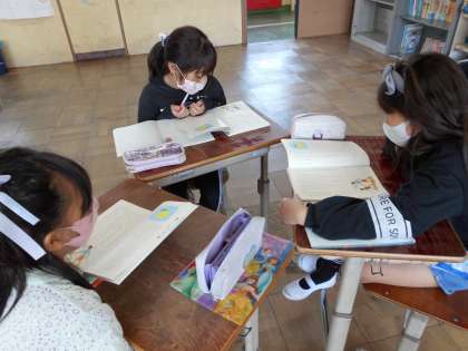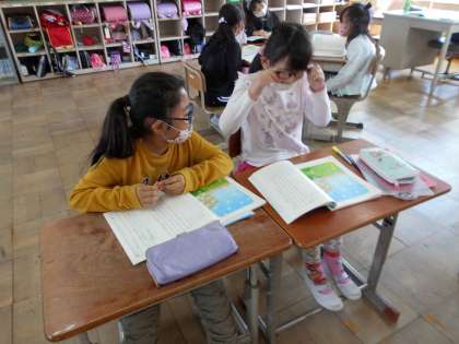 国語「白いぼうし」では,「女の子はちょうちょだったのだろうか」という問いについて考えました。また自分が「こういではないか」と考えていることの根拠を本文の叙述から見つけ,なぜそう思うのかをグループで話し合いました。みんなで話し合い,問いに関する答えを一人一人もつことが出来ました。