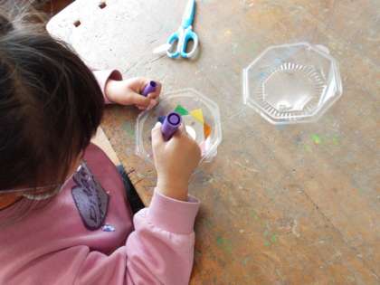 図工科の学習です。透明の容器に色をぬり,太陽の光に透かしてみたり,そこに水をはって光を透かしてみたりして楽しみました。「キラキラしている!」「きれい!!」と見ていました。友達の作品に影響を受けながら,いろいろと試していました。