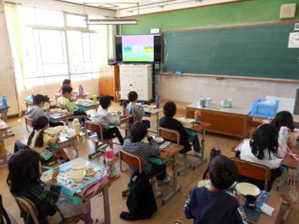 なごみ献立の日です。教室で「なごみ献立」の紹介ムービーを見ています。すまし汁のおだし,かきあげがどのような具でできているかなど学ぶことができました。和食についての知識を積み重ねています。