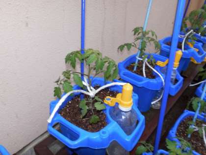 ミニトマトの苗が少し大きくなってきました。これからもっと元気に大きくなってもらうために支柱を立てました。風に負けずに,大きくなあれ!