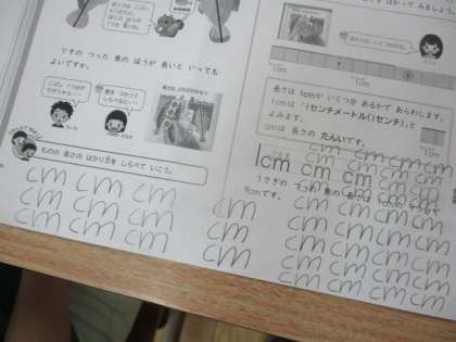 算数で長さの測り方や表し方を学習しました。ものを測る時にはものさしの端に合わせて測らないといけないことや長さは「cm」で表すことを学びました。何度も上手に「cm」の練習ができました。