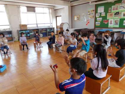 「じゃんけんぽん」の歌に合わせて,拍を感じながら『たん・たん・たん・うん』のリズムを手やカスタネットで打ちました。