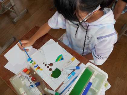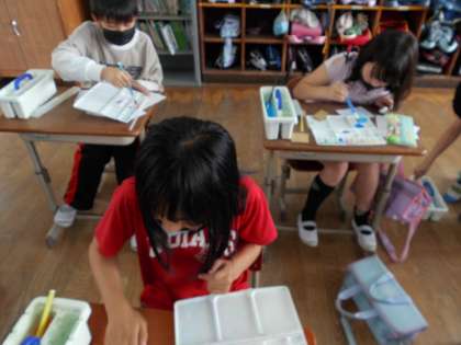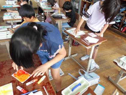 絵の具やいろいろな道具を使って,思いのままに描いてみることを楽しみました。にじみを楽しんだり,道具の使い方を工夫して楽しんだり,思い思いの描き方をしてカードを作りました。次の時間には,自分たちが作ったカードを並べて,思い浮かんだ気持ちに合うように構成したり,描き足したりしていきます。19人の心のもようが出来上がるのが楽しみですね。