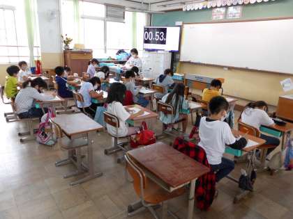 掃除が終わって,5時間目の学習までの帯時間に,かけ算の計算練習をしています。九九で答えが出る計算を5分間にどれだけとけるかに挑戦しています。九九を唱えることなく,すぐに答えに結び付く人がふえてきています。