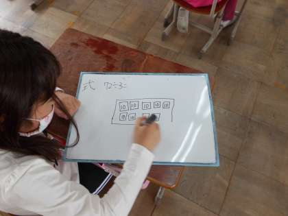 2桁÷1桁のわり算を筆算で計算できるようになるために,今日は,72÷3の計算の仕方を考えました。70を10のまとまりとして,ミニボードに図で表したことで,3つに分けるイメージがはっきりして,全体で話し合うことができました。