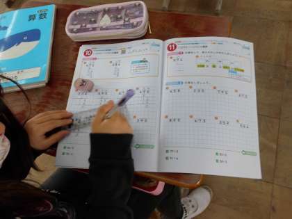 今日はわり算の筆算の計算の仕方を知りました。割られる数と割る数をわり算記号の中と左端に書いて,「答えを立てて」,「(立てた和人割る数を)かけて」,「ひいて」,「(次の位の数を)下ろして」を繰り返していきます。初めは,手順にとまどい,教科書を見ながら順番に進めていましたが,だんだん慣れてきて,答えを見つけるのが速くなっていきました。
