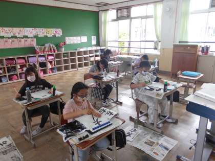 半紙に二文字を書くのは初めての経験で文字の大きさやバランスにも気を付けて,静かにもくもくと書く姿が見られました。