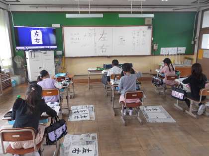 4年生は書写の毛筆の学習で「左右」という二文字を書きました。