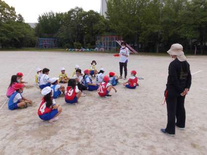 赤,青,黄,白の4チームに分かれ,4〜5人がバトンをつないでリレーをしています。バトンの渡し方やコーナートップで並ぶ順を決めること,また,テイクオーバーゾーンでのリードの仕方などにだんだん慣れてきました。それぞれのチームの差も縮まっています。