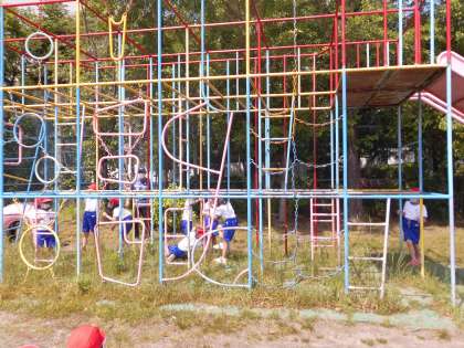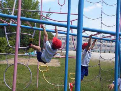 遊具を使うときの約束を確かめた後,総合遊具の1階探検をしました。