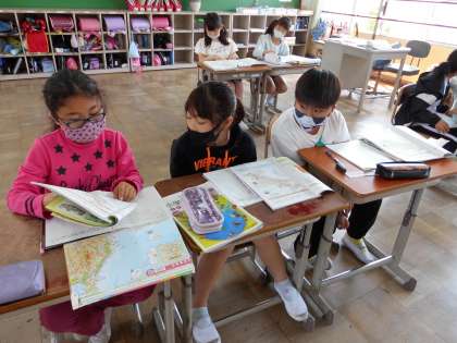 社会「京都府の様子」では,京都府の交通の様子はどのようになっているのか,予想して調べました。そして京都市を中心に道路や鉄道が様々な市にのびていること,土地の高いところや人口の少ないところには道路や鉄道が少ないことなどがわかりました。京都府がどのようなところなのか,地形や土地の利用について,また人口などについて,様々なことがわかってきた4年生です。
