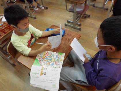 写真は,友達に問題をつくって出している様子です。今回,正解できない人もいましたが,今後,正解するためにどうすればいいかを考えて,ポイントをまとめていきます。