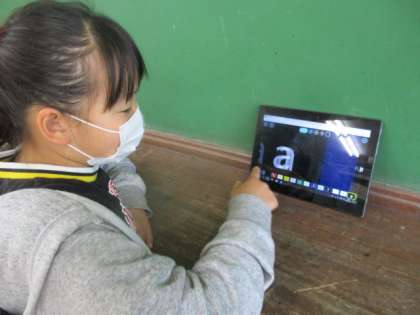 外国語の「Hello」のまとめとして,5年生にかかわりの深い先生に英語で自己紹介をしました。タブレットに入力したことをもとに自分の名前のスペルや「I like 〜」と好きなものを伝えました。また,「Do you like〜?」と質問したり,質問されたことに答えたりしていました。一人一人素敵な自己紹介ができました。