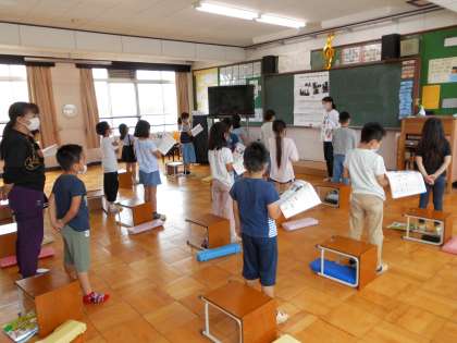 音楽室で「友だち」を歌いました。一続きで歌うのではなく,休符記号に気をつけて区切りを付けて歌えるように練習していく中で,元気に楽しそうに歌うことができていました。
