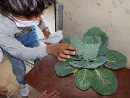 今日,小さな幼虫が,キャベツの葉をかじって小さな穴をあけていました。このまま成長していくようすを観察していきたいと思います。