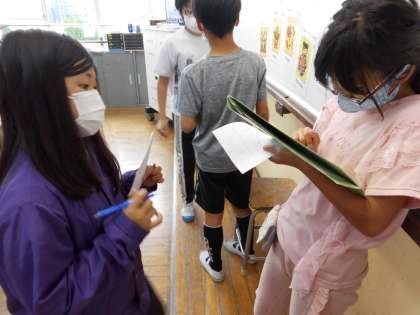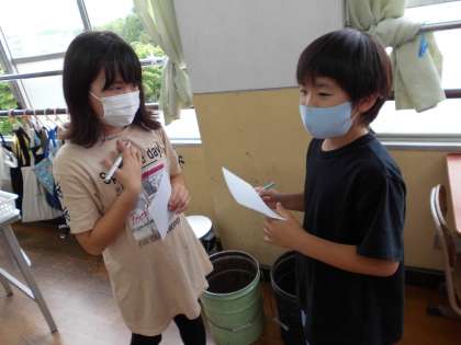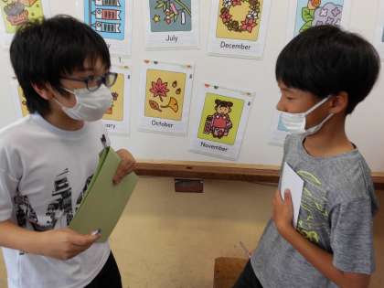 外国語で”゛When is your birthday?”の学習をしています。この学習の最後に,石田小学校の教職員の方々にお誕生日や,お誕生日にどのようなものがほしいのかを尋ねにいきます。そのために,今日は友達とお誕生日についてたずね合いました。日本語なら友達の誕生日をよく知っているけれど,英語で言うとなると・・・・と尋ねる人も答える人も真剣に考えながらやり取りを楽しんでいました。