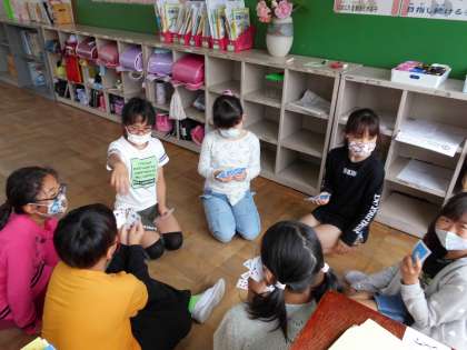 休み時間に,みんなでトランプを。ばばぬきをしたりスピードをしたりしていました。雨の日もクラスみんなで,教室で楽しく過ごしています。