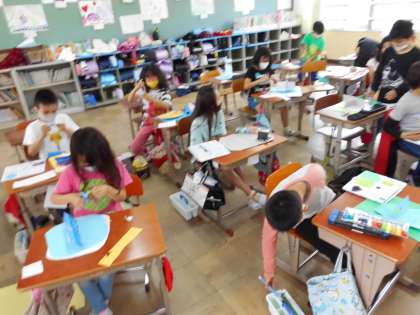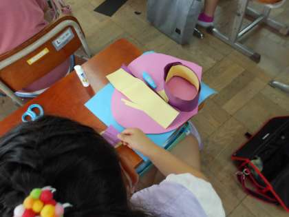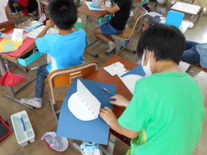 3年生は図工の学習で,わりピンと画用紙を使って,土台がくるくるまわる仕組みを利用した作品を作っています。