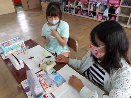 理科「電池のはたらき」では,かん電池の向きを変えると電流の向きも変わるのかを予想し,簡易検流計で調べました。