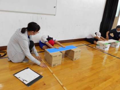 新体力テストに参加しました。ソフトボール投げや長座体前屈など,どの記録も去年より伸びていました。すごいですね!