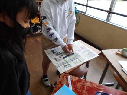 新聞とホチキスを使って手提げかばんを作りました。作っていると,どこを丈夫にすればいいのかがわかってきました。わかったことをトートバックづくりに生かしていきます。